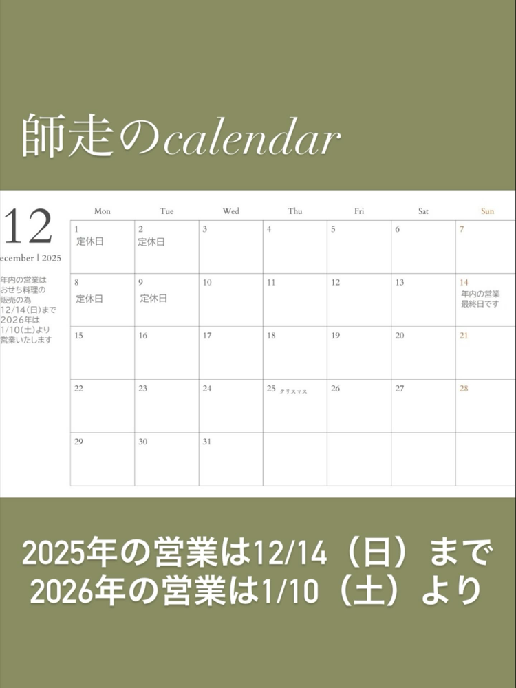 1カ月の間に数回、お弁当のご予約を多数いただき、止むを得ず店内の営業を休業する日がございます。小さな店のこと、ご理解賜りますと幸いに存じます。