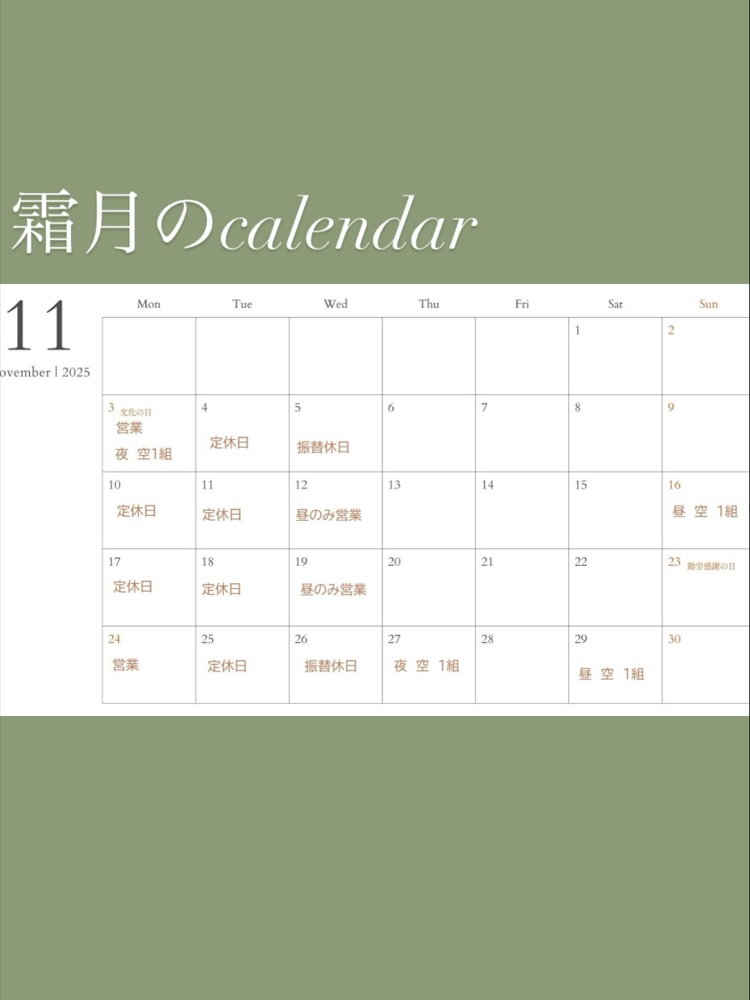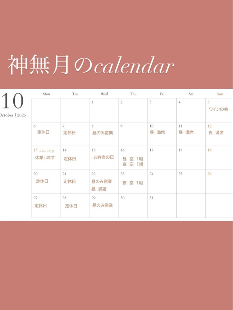 カレンダーは10月15日現在のものです。ご予約については